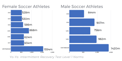 The table below displays the results your team has entered for the Yo-Yo Intermittent Recovery Test. This is part of the assignment in Lesson 4. This test is a really good measure for cardiovascular endurance. It is a great way to put a number on their fitness level. There have been some studies done on normal values with this test. Here is a display of norms for youth soccer players. You can use this data as a reference point for your team and sport.